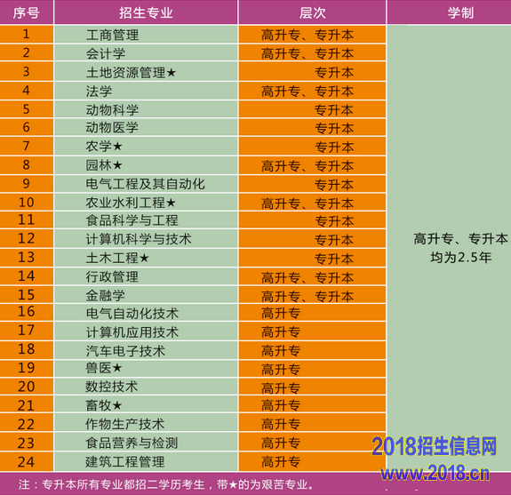 东北农业大学成人教育继续招生。凡第一志愿报考我校艰苦行业(带★号专业为艰苦行业)的考生在成人高考录取时,可享受较大幅度降分录取照顾政策。