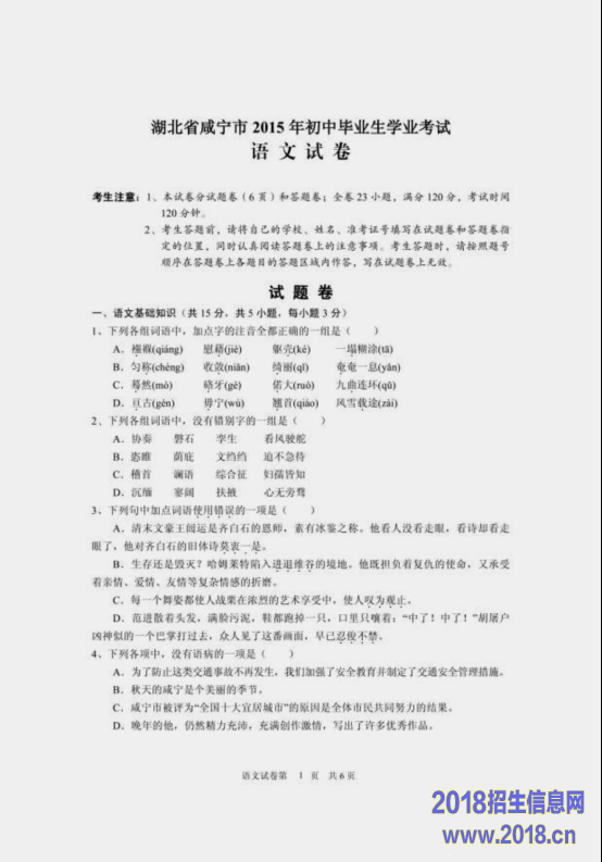 2015年湖北省咸宁市中考语文试题(扫描版,含答案)