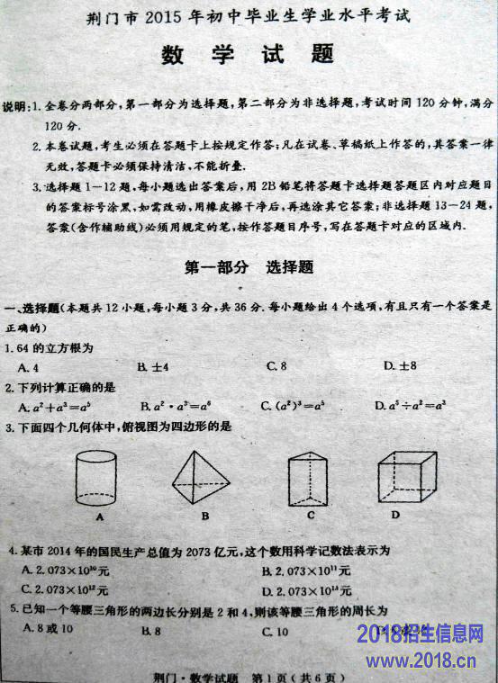 2015年湖北省荆门市中考数学试题(扫描版,有答案)