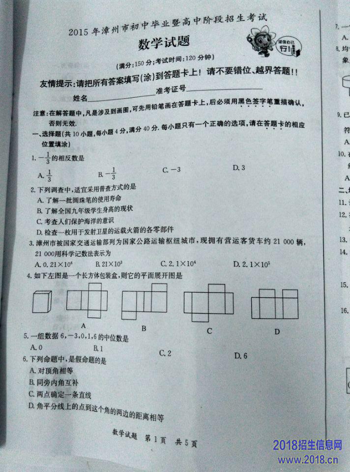 2015年福建省漳州市中考数学试卷(扫描版,无答案)