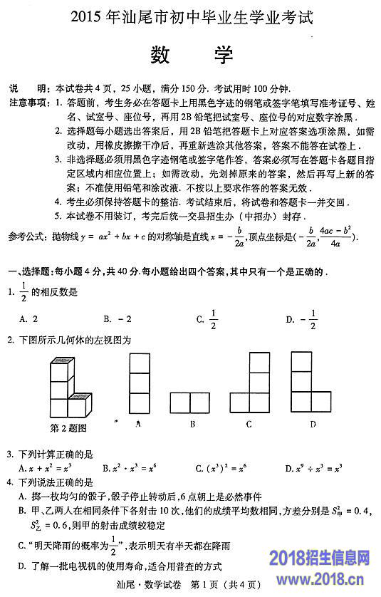 2015年广东汕尾中考数学试题(图片版)