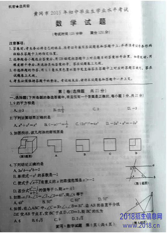 2015年湖北黄冈中考数学试题及答案(图片版)