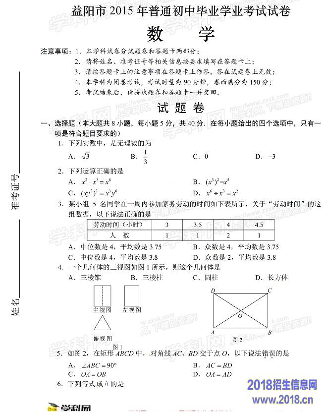 2015年湖南益阳中考数学试题及答案(图片版)