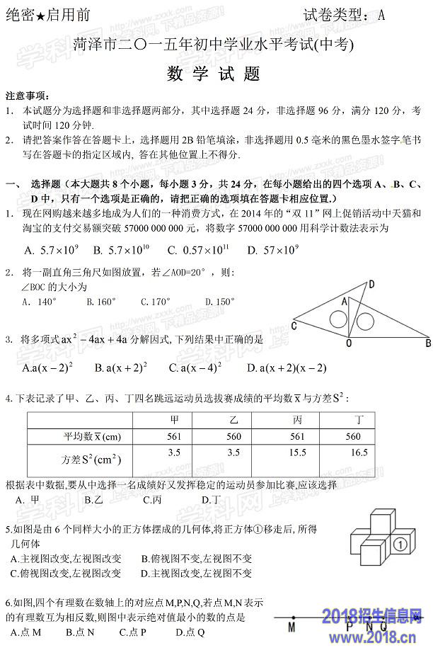 2015山东省菏泽市中考数学试题及答案(图片版)