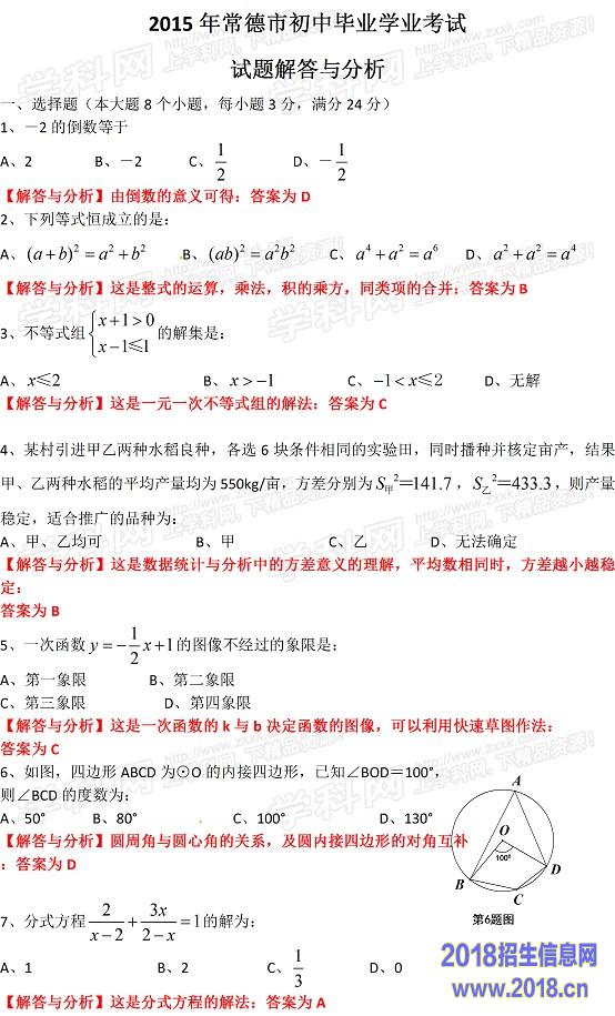 2015年湖南省常德市中考数学试题及答案(图片版)