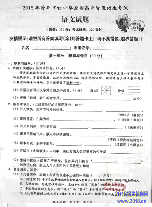 2015年福建省漳州市中考语文试题(扫描版,含答案)