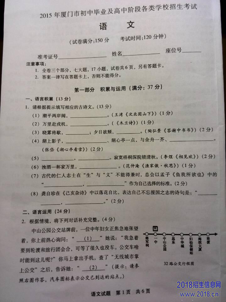 2015年福建省厦门市中考语文试卷(扫描版,无答案)