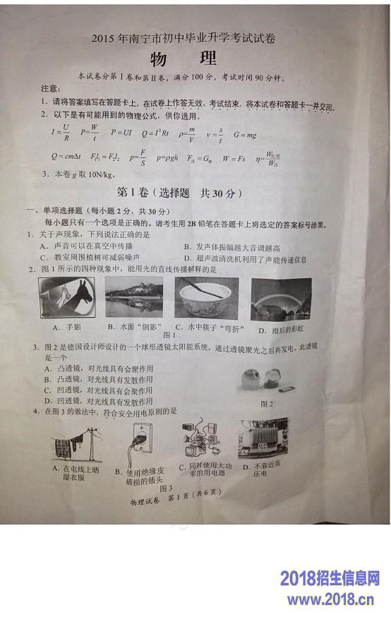 2015年广西南宁中考物理试题(图片版)