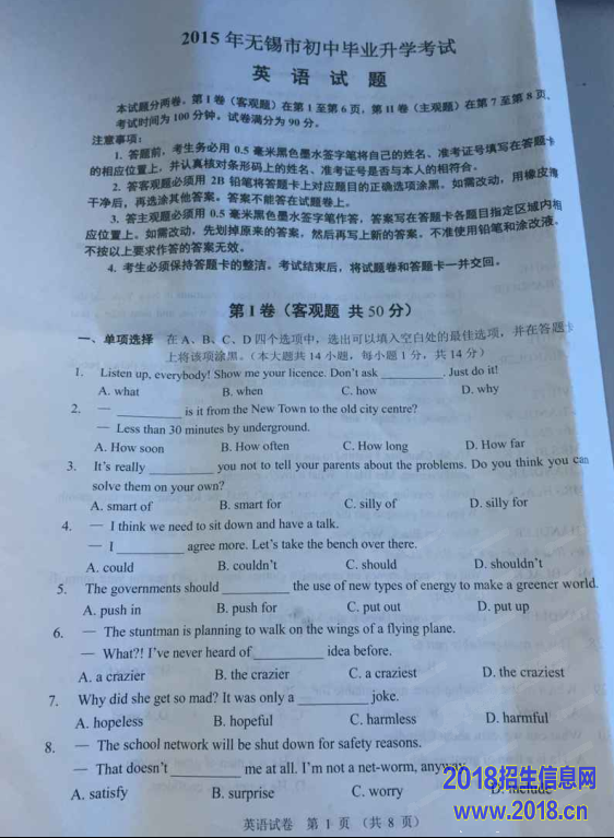 2015年江苏省无锡市中考英语试题(扫描版,无答案)