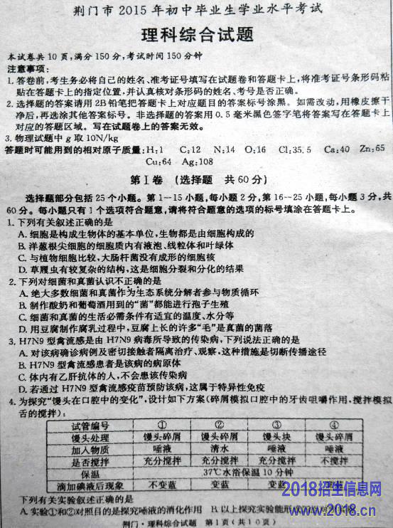 2015年湖北省荆门市中考理综试卷(扫描版,含答案)