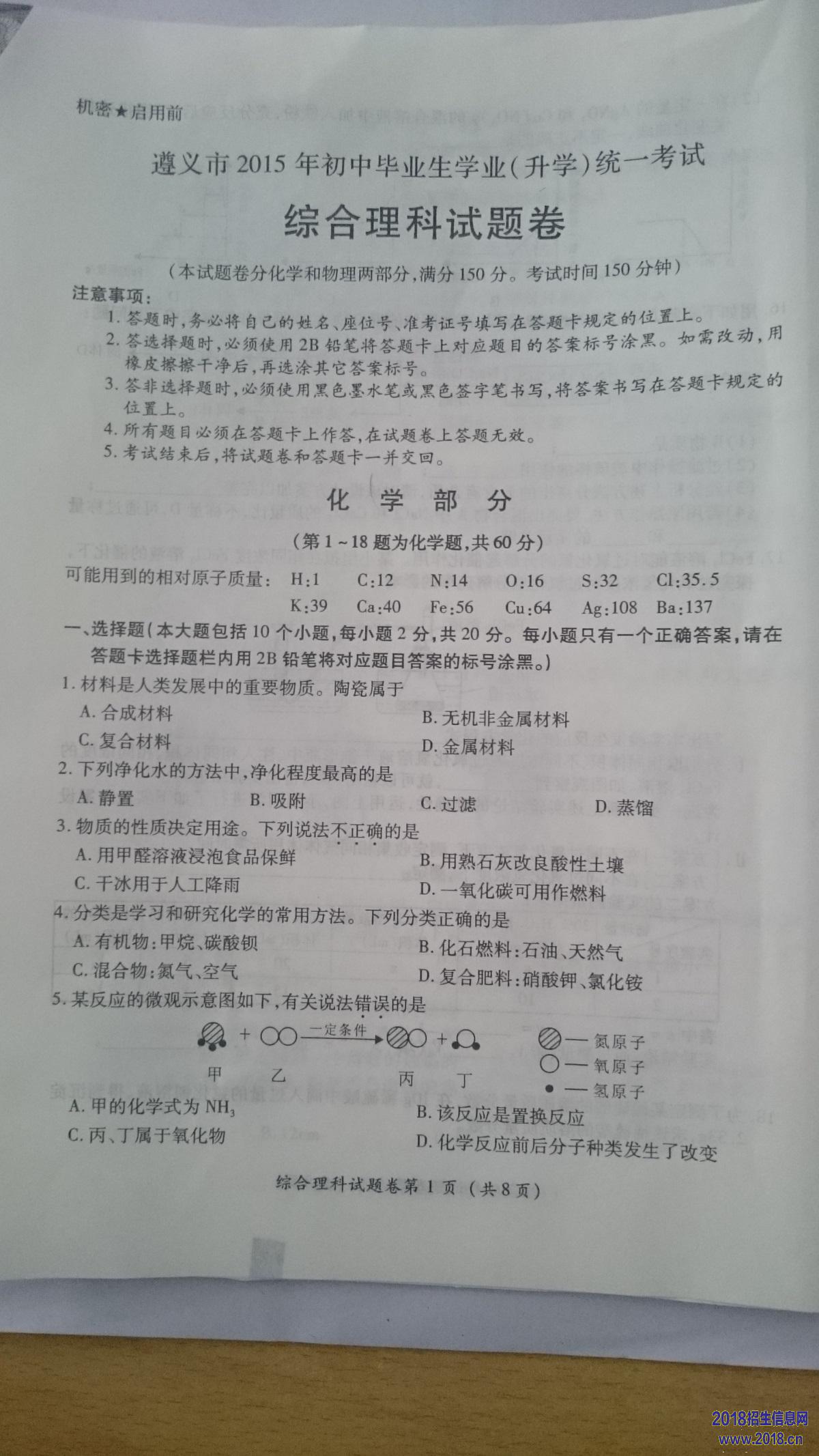 2015年贵州省遵义市中考化学试题及答案(扫描版)