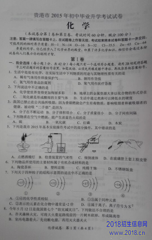 2015年广西贵港市中考化学试题(扫描版,无答案)