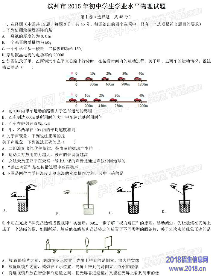2015年山东省滨州市中考物理试题及答案(图片版)