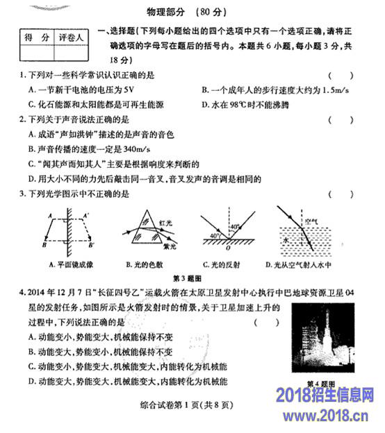 2015年甘肃省武威市中考物理试题及答案(图片版)