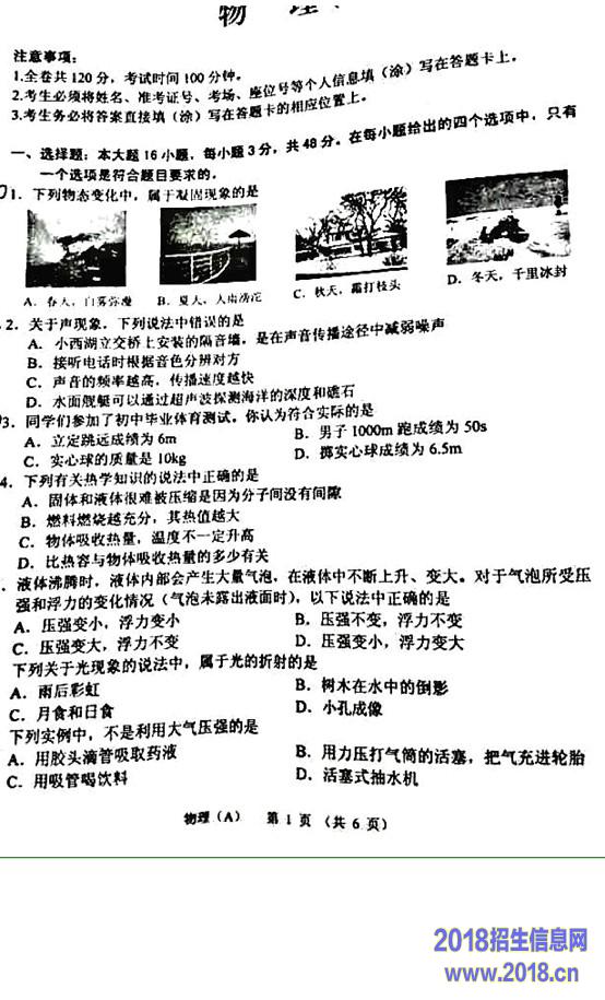 2015年甘肃省兰州市中考物理试题及答案(图片版)