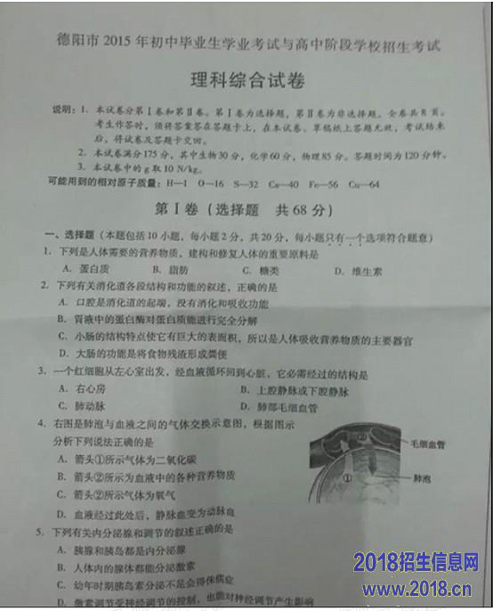 2015年四川省德阳市中考理科综合试题及答案(图片版