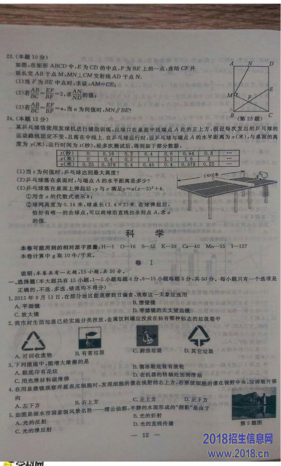 2015年浙江丽水市中考科学试题及答案(图片版)