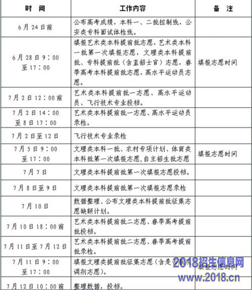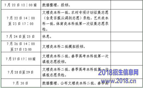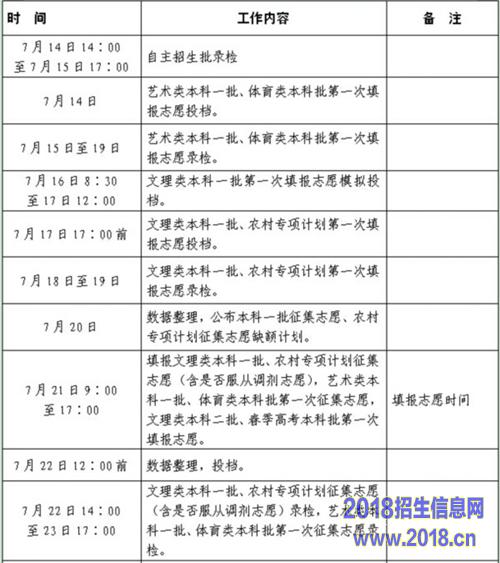 7月21日:文理类本科一批,农村专项计划征集志愿(含是否服从调剂志愿),艺术类本科一批,体育类本科批第一次征集志愿,文理类本科二批,春季高考本科第一次填报志愿。