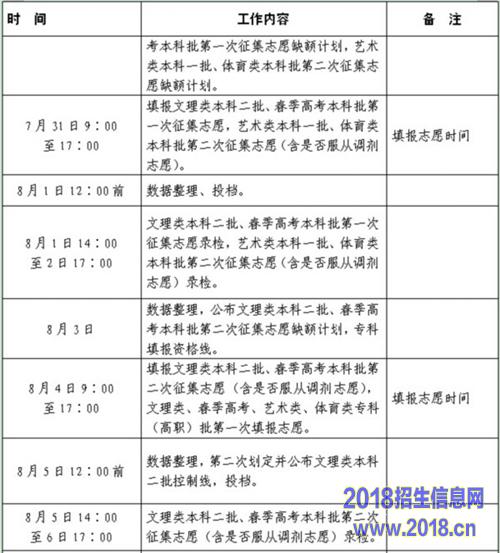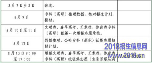 8月4日:文理类本科二批,春季高考本科第二次征集志愿(含是否服从调剂志愿),文理类专科(高职)批第一次填报志愿,春季高考,艺术类,体育类专科(高职)批第一次填报志愿。