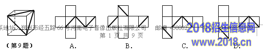 9.如图的正方体盒子的外表面上画有3条粗黑线,将这个正方体盒子的表面展开(外表面朝上),展开图可能是 ( )