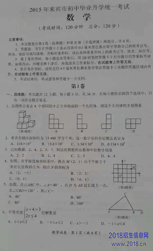2015年广西省来宾市中考数学试题(扫描版无答案)