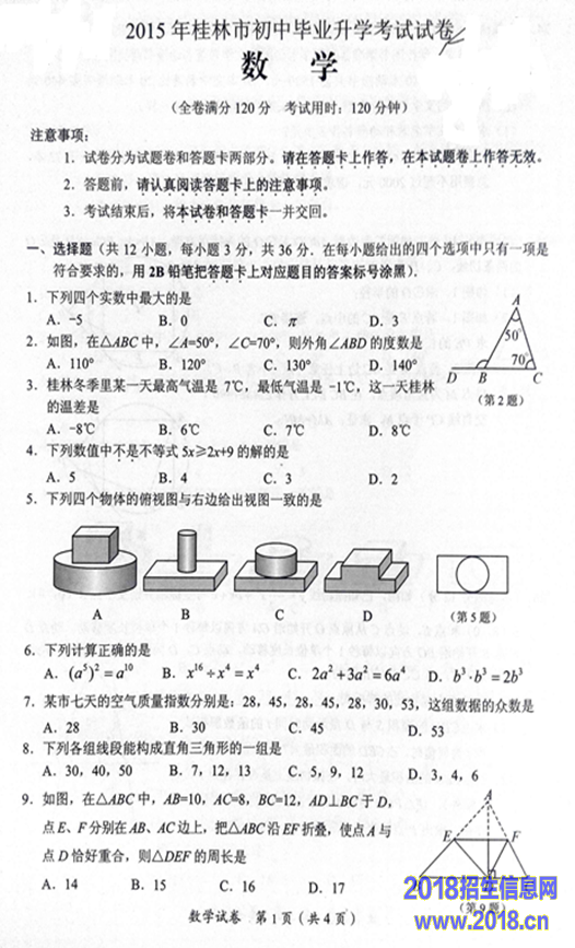 2015年广西桂林市中考数学试题(扫描版无答案)