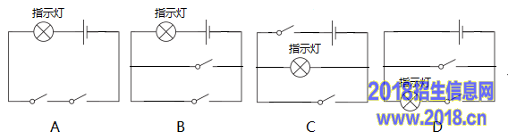 9.岳阳城区新投入的公交车后门左右扶杆上均装有一个红色按钮(如图),每个按钮相当于一个开关。当乘客按下任一按钮。驾驶台上的指示亮,提醒司机有人下车。下列电路图能实现上述目标的是( )