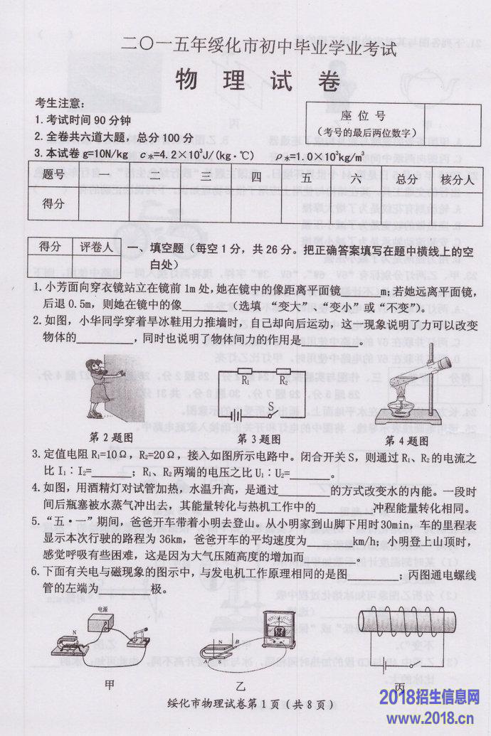 2015年黑龙江省绥化市中考物理试卷(扫描版,含答案)