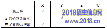 的硝酸盐溶液和W 的硝酸盐溶液,进行有关实验,结果如下表(“√”表示能反应,“—”表示