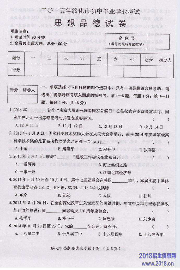2015年黑龙江省绥化市中考思想品德试卷(扫描版,含答案)