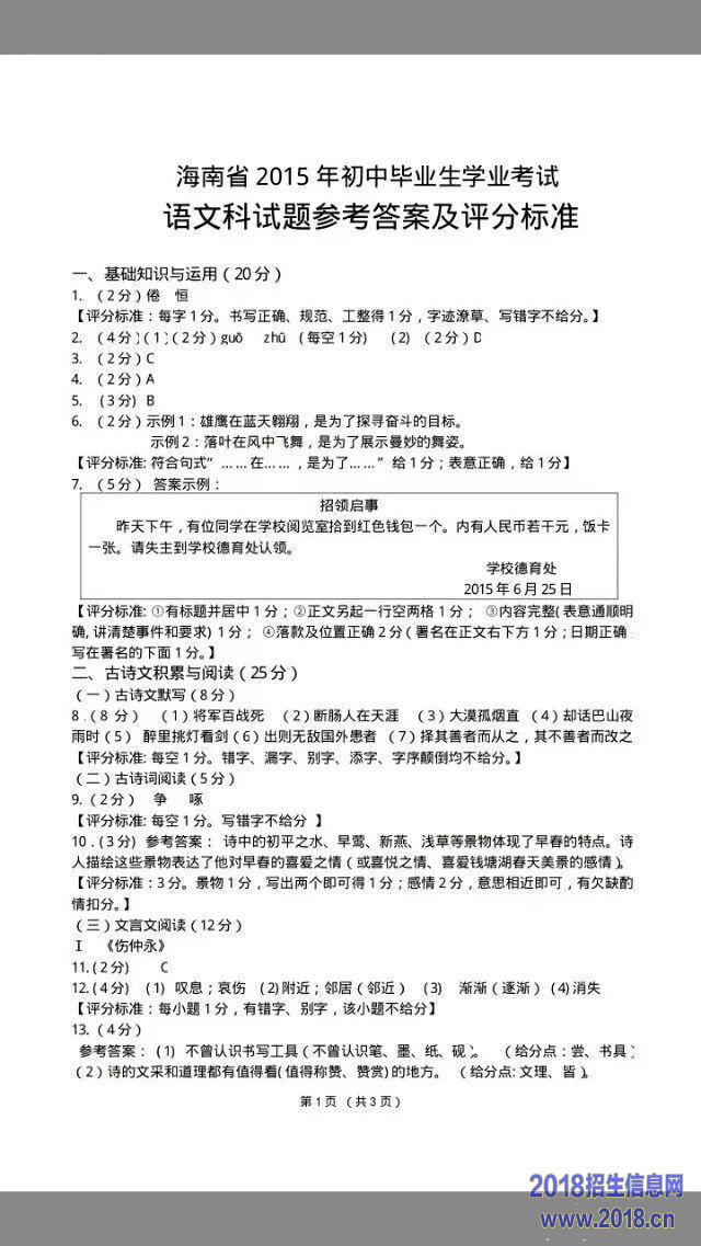 2015年海南省中考语文试题(word版,含答案)