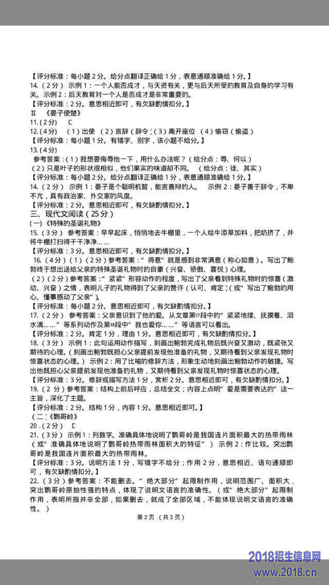 17.选文第②段中说“可他父亲从没意识到他的爱”,读完文章,请说说父亲是否意识到了他的爱,并简述理由。(2分)