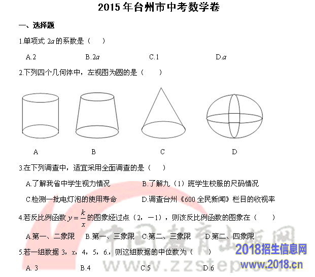2015年浙江省台州市中考数学试卷及答案(图片版)