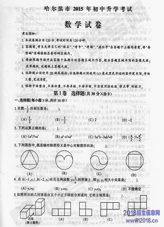 2015年黑龙江省哈尔滨市中考数学试卷(扫描版含答案)