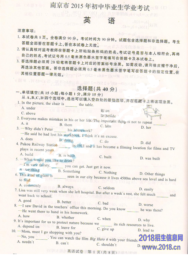 2015年江苏省南京市中考英语试题(扫描版,有答案)