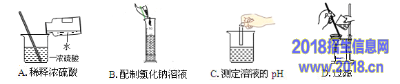 【解析】稀释浓硫酸时,要把浓硫酸缓缓地沿器壁注入水中,同时用玻璃棒不断搅拌,以使热量及时地扩散;一定不能把水注入浓硫酸中。配制溶液时要在烧杯中配制,不能用量筒。测定溶液的酸碱度,不能把PH试纸直接放入溶液中。过滤的操作要领为“一贴,二低,三靠”。