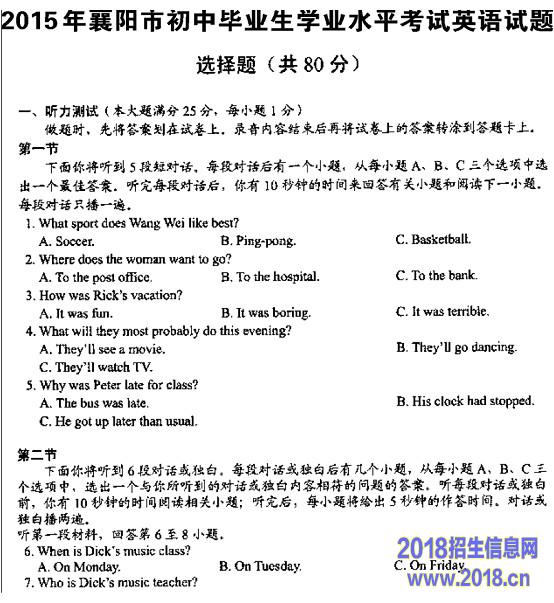 2015年湖北襄阳中考英语试题及答案(图片版)