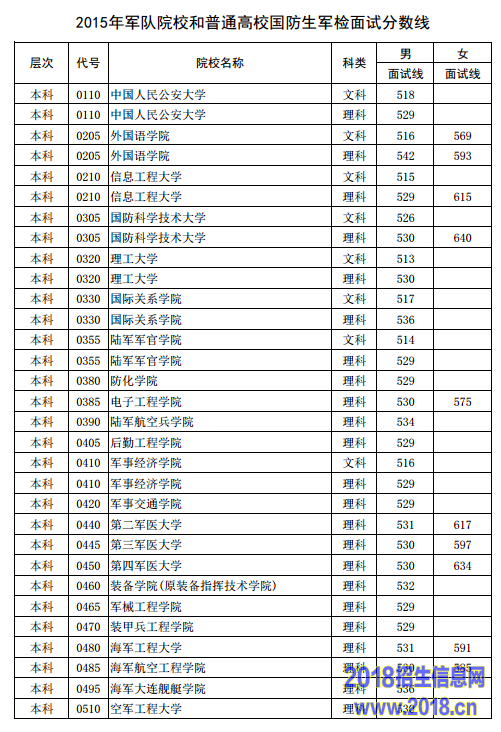 2015年河南省普通高招军队院校和普通高校国防生军检面试分数线