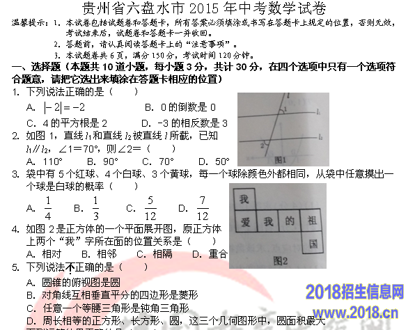2015年贵州省六盘水市中考数学试题(图片版,含答案)