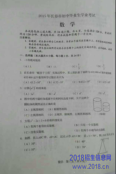 2015年吉林省长春市中考数学试题(扫描版无答案)