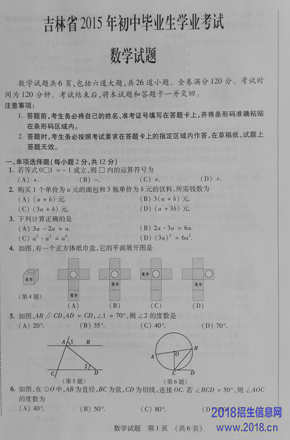 2015年吉林省中考数学试题(扫描版无答案)
