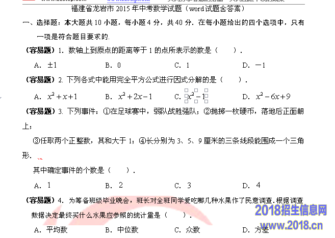 2015年福建省龙岩市中考数学试题(图片版含答案)