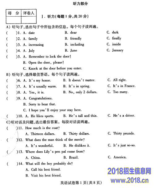 2015年甘肃省白银市中考英语试卷(扫描版,含答案)