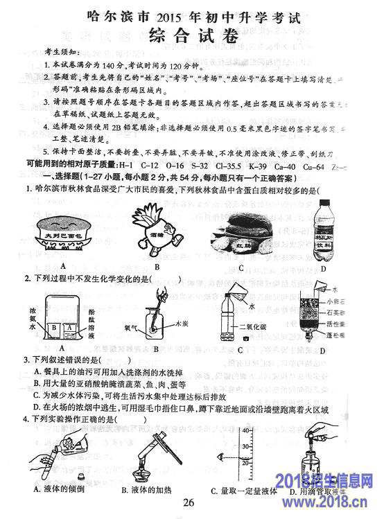 2015年哈尔滨中考理综试题及答案(图片版)