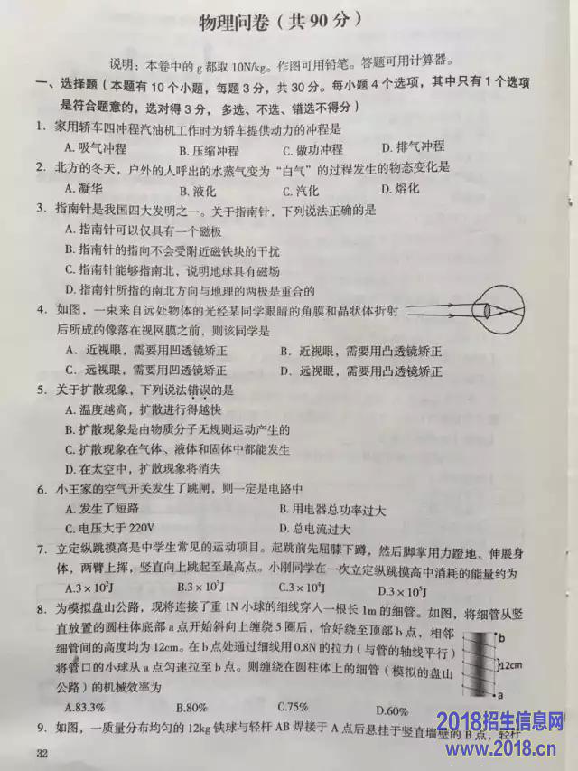 2016年巴中中考理综试题及答案