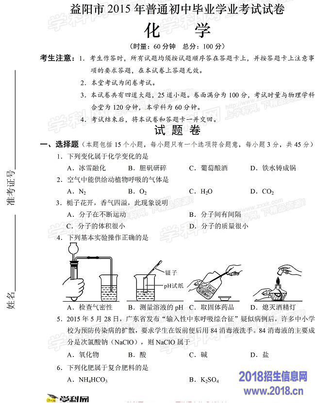 2015年湖南益阳中考化学试题及答案(图片版)