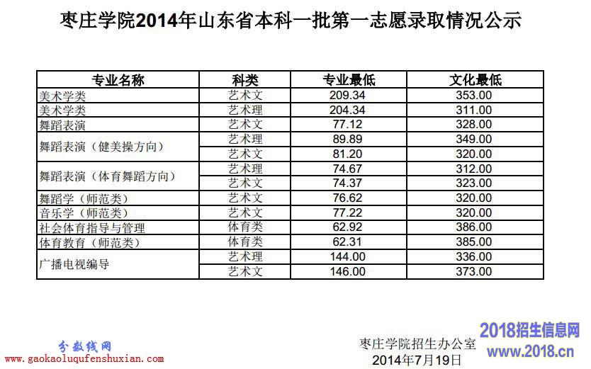 枣庄学院2014年录取分数线 枣庄学院2014年山东省本科一批第一志愿录取情况公示