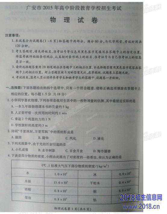2015四川广安市中考物理试题(图片版)