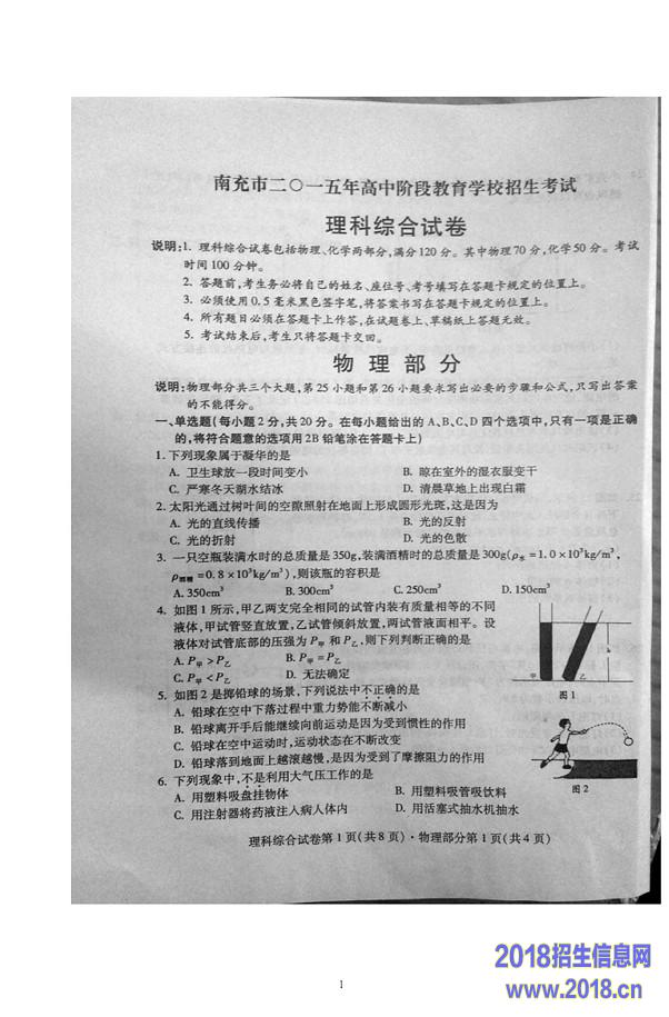 2015年四川省南充市中考理综试题(扫描版,无答案)