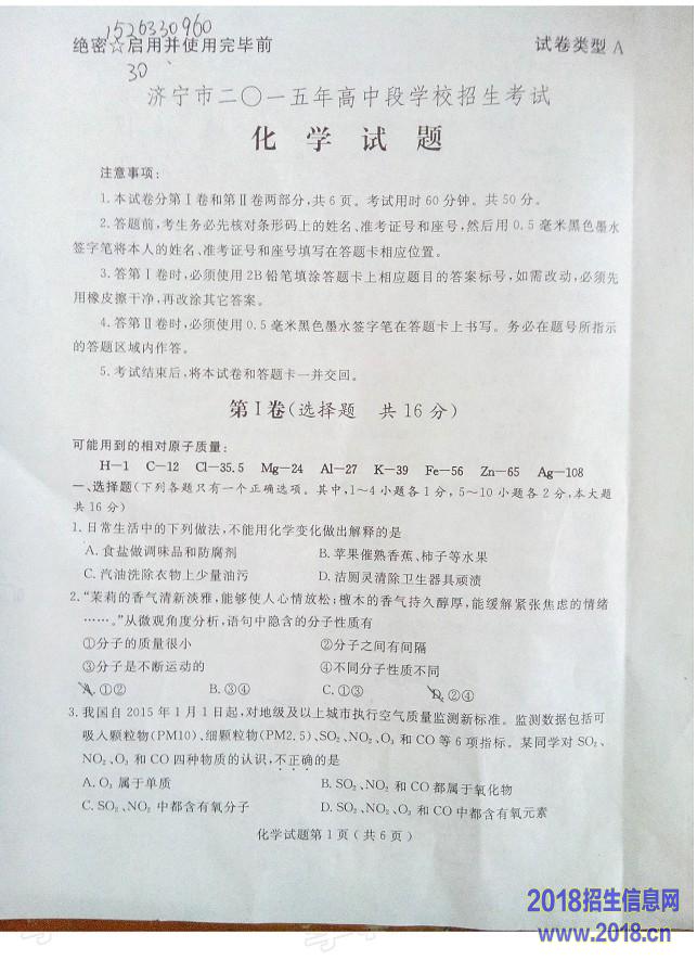 2015济宁市中考化学试题及答案(图片版)